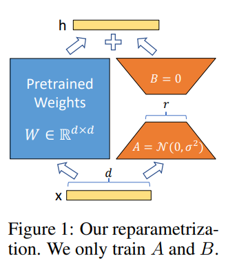 - 개념: 기존 모델의 가중치 행렬(W)에 변화를 주는 대신, 작은 두 행렬(A, B)을 추가하여 이들만 학습합니다. 최종적으로 모델의 출력은 원래 가중치(W)와 학습된 변화량(BA)을 더한 값(W + BA)을 통해 계산됩니다.