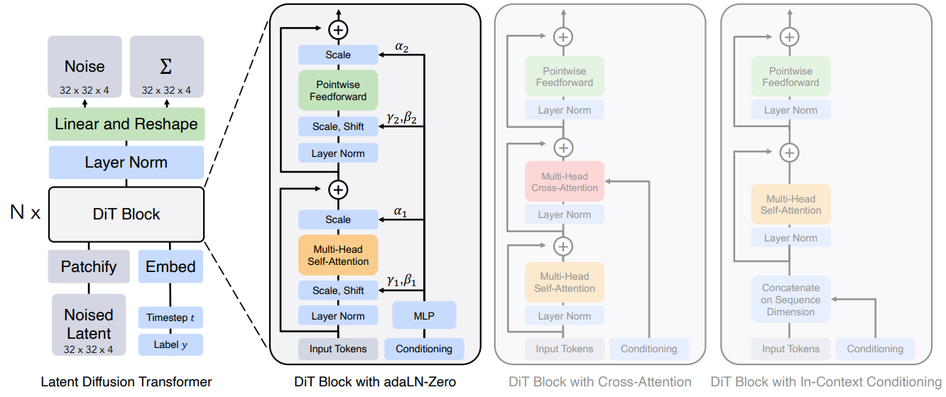 - 잠재 확산 모델 (Latent Diffusion Model, LDM): 고해상도 이미지 픽셀 공간에서 직접 확산 모델을 학습하는 것은 계산 비용이 매우 큽니다. LDM은 이미지를 저차원의 잠재 공간(latent space)으로 압축한 뒤, 이 잠재 공간에서 확산 과정을 수행하여 계산 효율성을 크게 높인 모델입니다. DiT 역시 이러한 잠재 공간에서 작동하는 경우가 많습니다.