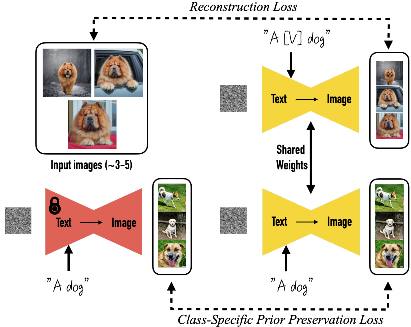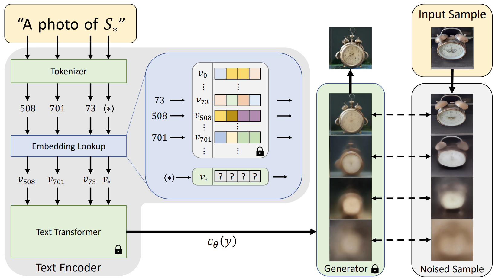 개념: 모델의 가중치는 전혀 변경하지 않고, 새로운 개념(스타일, 객체)을 나타내는 새로운 단어에 대한 임베딩 벡터만 학습합니다.