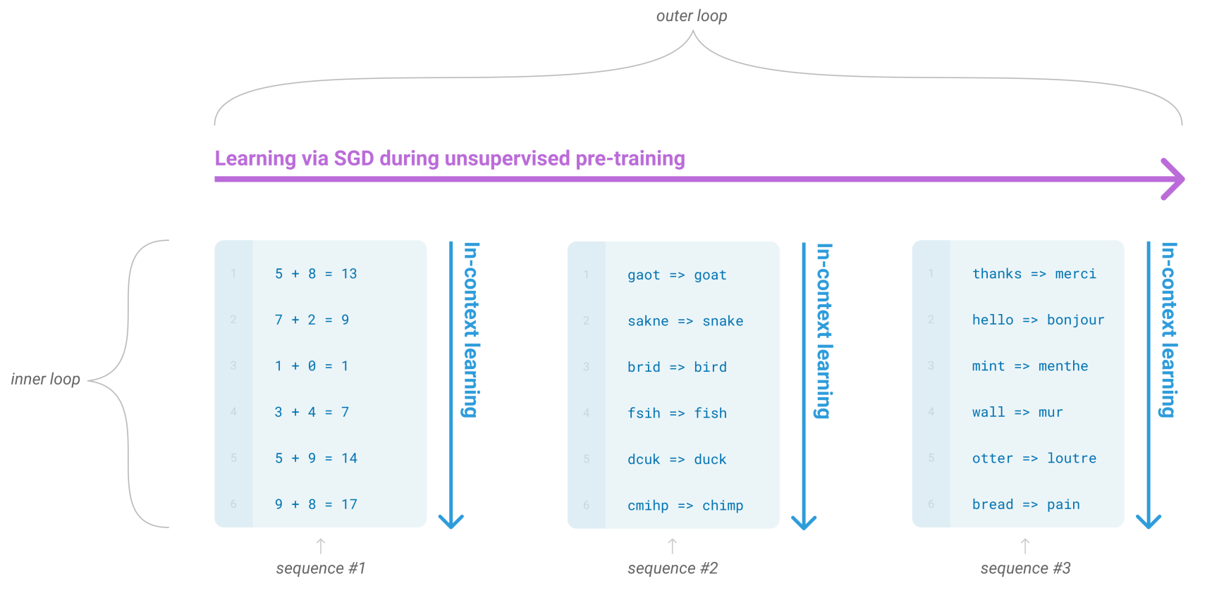 - 개념: GPT-3와 같이 수천억 개의 파라미터를 가진 거대 모델들은 방대한 양의 텍스트 데이터로 사전 학습하는 과정에서 세상의 다양한 지식, 언어적 패턴, 추론 능력 등을 내재화합니다. 이를 바탕으로 프롬프트 내의 단 몇 개의 예시만으로도 해당 작업의 본질을 빠르게 간파하고, 그 숨겨진 규칙을 새로운 문제에 성공적으로 적용하는 놀라운 능력을 보여줍니다. 모델이 클수록 예시로부터 더 빠르게 학습하는 경향이 나타나며, 이는 예시의 개수가 늘어날수록 성능 증가 폭이 더 커지는 것으로 확인됩니다.