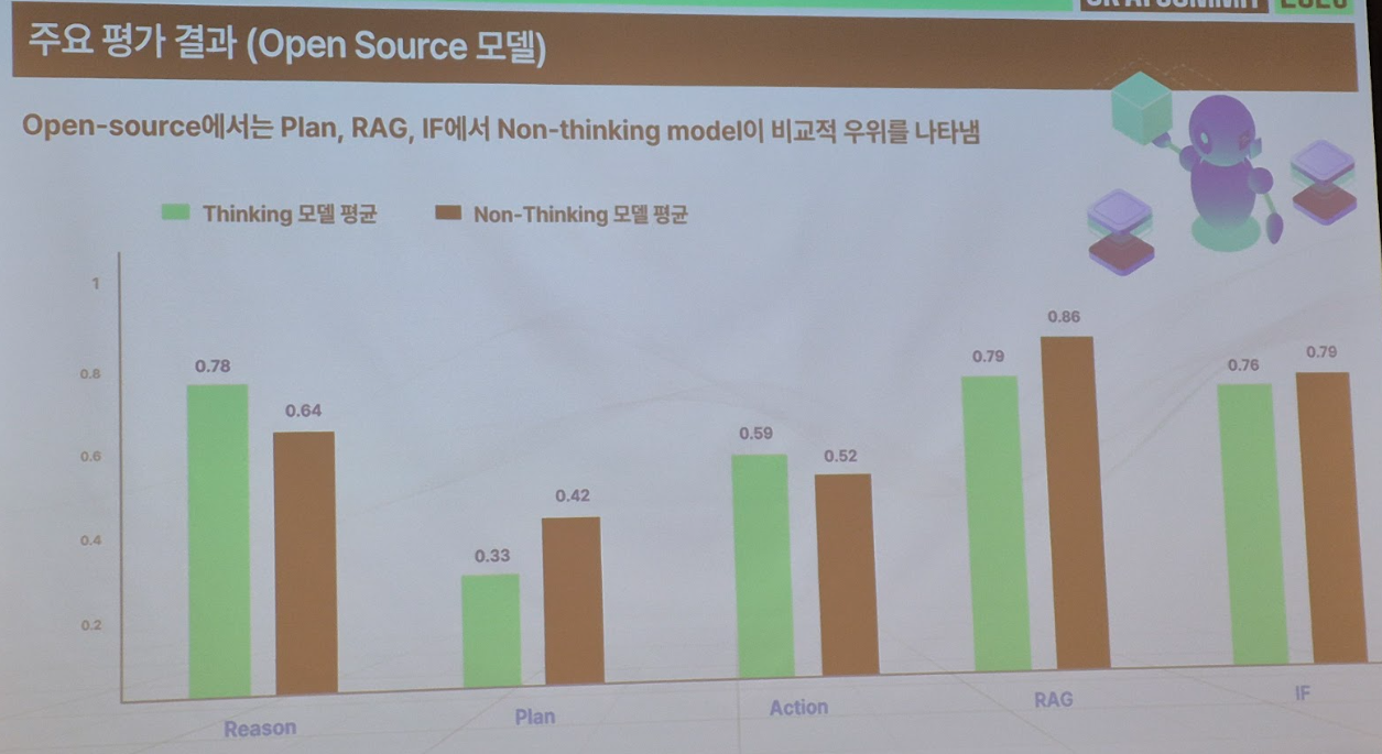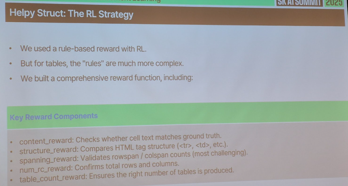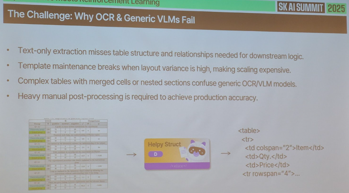 - 시사점: 지도학습(SFT)과 강화학습(RL)을 통해 특정 도메인(예: 국사)에서 매우 높은 정확도를 내는 특화 모델을 개발함. 다만 특화 모델 특성상 일반화 성능은 다소 낮을 수 있음. 또한 생성 모델과 평가 모델을 에이전트 구조로 연결해 “항상 정확한 답변만 반환”하도록 설계했으며, 한국 문서 및 사내 문서(표·차트)를 정확하게 파싱하기 위해 VLM(Helpy Struct)도 커스터마이징하여 산업에 적용함. 현재 트렌드는 ‘도메인 특화 모델을 활용한 실전 비즈니스 문제 해결’임을 시사.