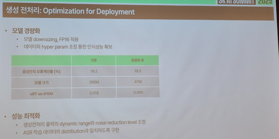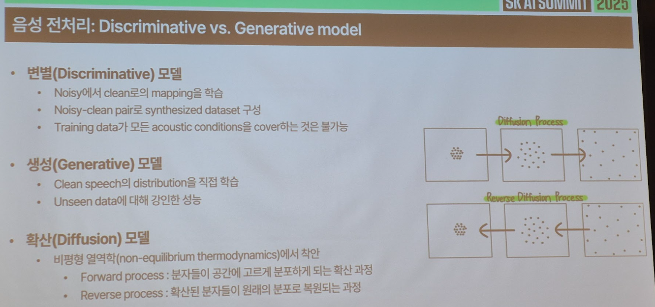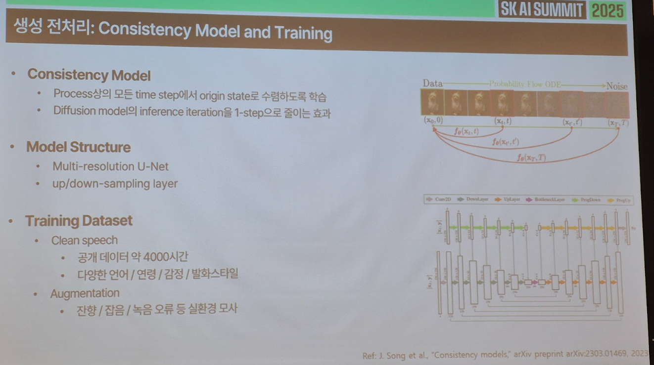 - 내용: AI 기술이 대중화되면서 음성인식은 단순한 음성 명령 제어를 넘어서 회의록 자동 생성, 강의 녹취 등 생산성 도구로 빠르게 확장되고 있습니다. 하지만 실환경의 녹음은 소음·반향·잡음이 뒤섞여 있어 기존 ASR 기술만으로는 충분한 정확도를 확보하기 어려웠습니다. 이에 Generative AI를 활용한 음성 전처리 기술을 도입하여 ASR 성능을 획기적으로 개선했습니다. Diffusion Model 기반 생성 기술을 통해 잡음과 반향을 제거하고 깨끗한 음성 신호를 복원함으로써, 기존 ASR 모델의 한계를 극복하고 실제 서비스 품질을 한 단계 끌어올린 것입니다.