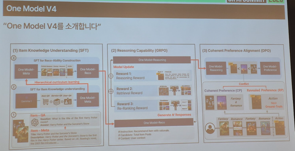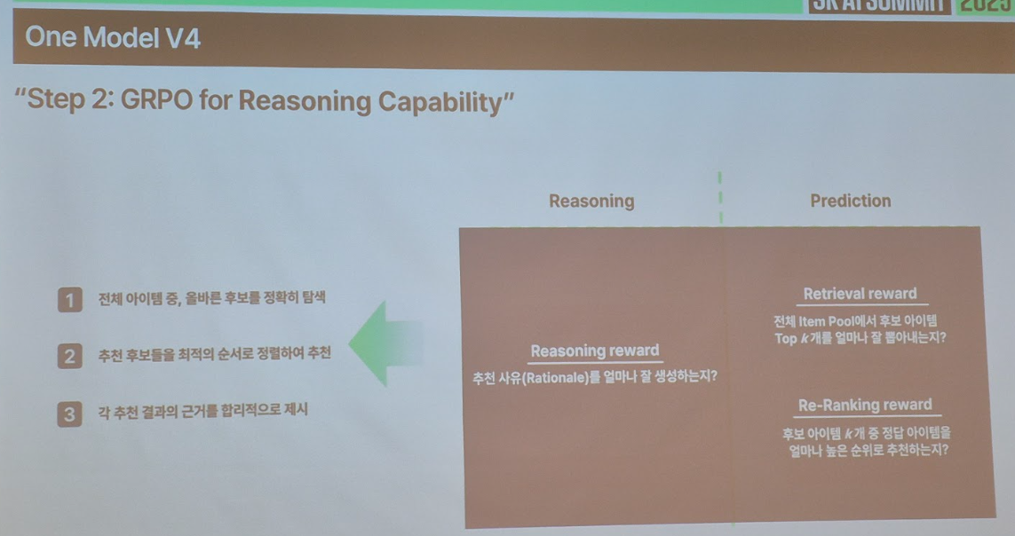 - 시사점: 도메인별 추천 모델의 한계를 극복하기 위해 SFT 및 RL 기반의 파인튜닝을 수행하고, 데이터 전처리 과정에 멀티에이전트 아키텍처(Supervisor)를 도입하여 효율성을 극대화. 이를 통해 다양한 서비스에 일관된 고성능 추천을 제공할 수 있는 통합 모델을 구축