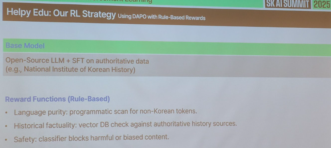 - 내용: 오픈소스 대형 모델들이 널리 활용되는 시대이지만, 특정 도메인에 특화된 고신뢰 모델을 개발하는 일은 여전히 어려운 과제입니다. 특히 신뢰할 수 있는 데이터가 부족한 분야에서는 성능 확보가 더욱 어렵습니다. ‘Helpy’ 개발 과정에서는 이러한 한계를 강화학습으로 극복했습니다. Helpy Edu는 국사편찬위원회 데이터를 기반으로 학습된 교육용 챗봇으로, 제한된 데이터 환경에서도 강화학습을 통해 사실 오류 없이 안정적이고 정확한 답변을 생성하도록 개선되었습니다. 또한 Vision-Language 모델인 Helpy Struct를 통해 이미지 속 표·문서를 정확하게 구조화하여 실사용에 적용한 사례