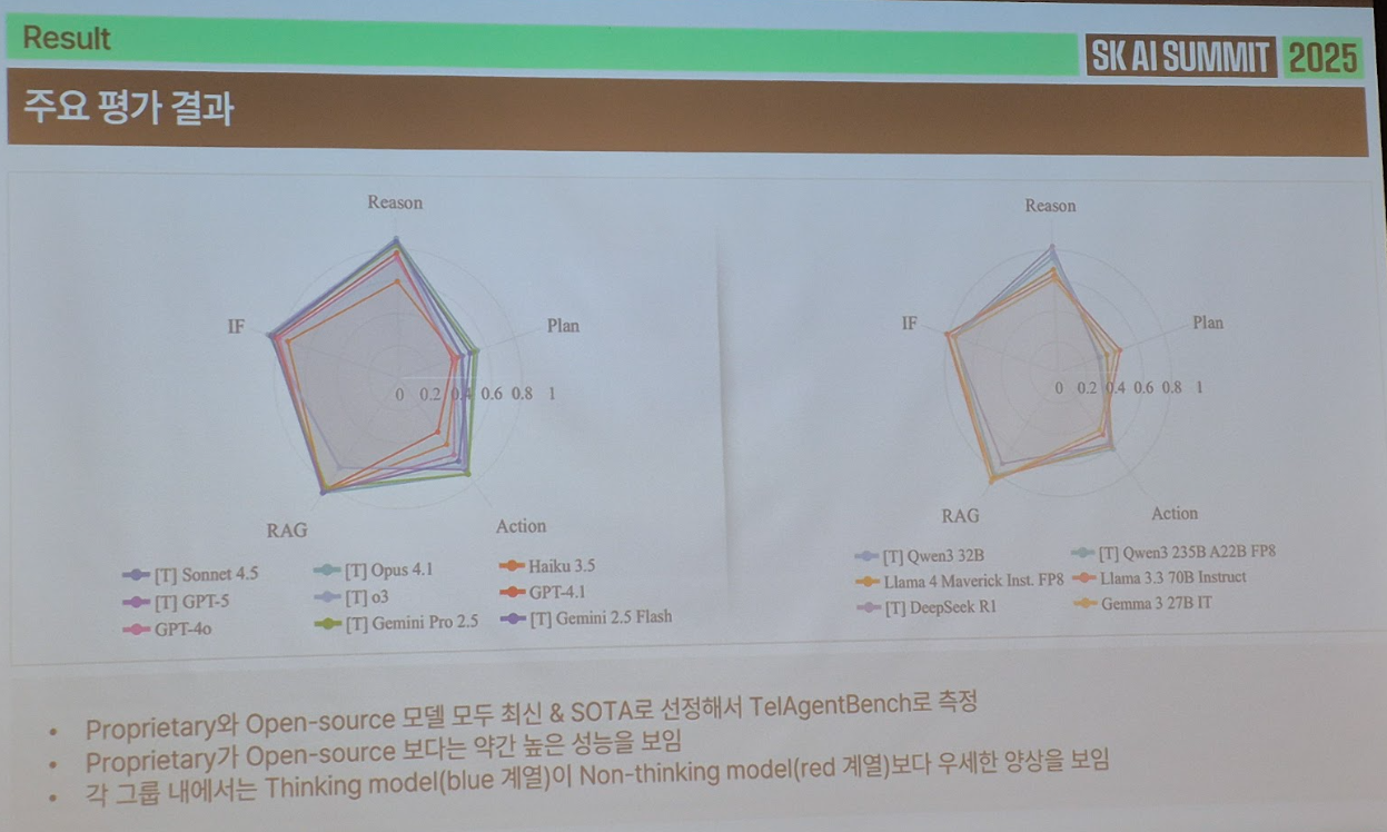 - 내용: LLM 기반 Agent는 빠르게 고도화되고 있지만, 통신 분야에 특화된 성능 평가 기준은 아직 부족합니다. SK텔레콤은 통신 서비스에 필요한 Agent의 핵심 능력을 Action, Planning, Reasoning, Instruction Following, RAG의 다섯 가지로 정의하고, 이를 반영한 TelAgentBench를 구축했습니다. 한국어 기반 명령 이해, 로밍 규정, API 호출 등 실제 상용 서비스에서 요구되는 조건을 포함해 상용·오픈소스 모델을 다각도로 평가했으며, 이를 통해 모델별 공통 패턴 및 고유한 장단점을 분석